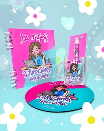 Kit completo de Directoria Financiera, incluye: Agenda permanente (sin fechas), mug en vidrio, lapicero y pad mouse.
