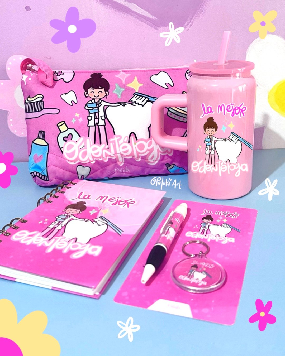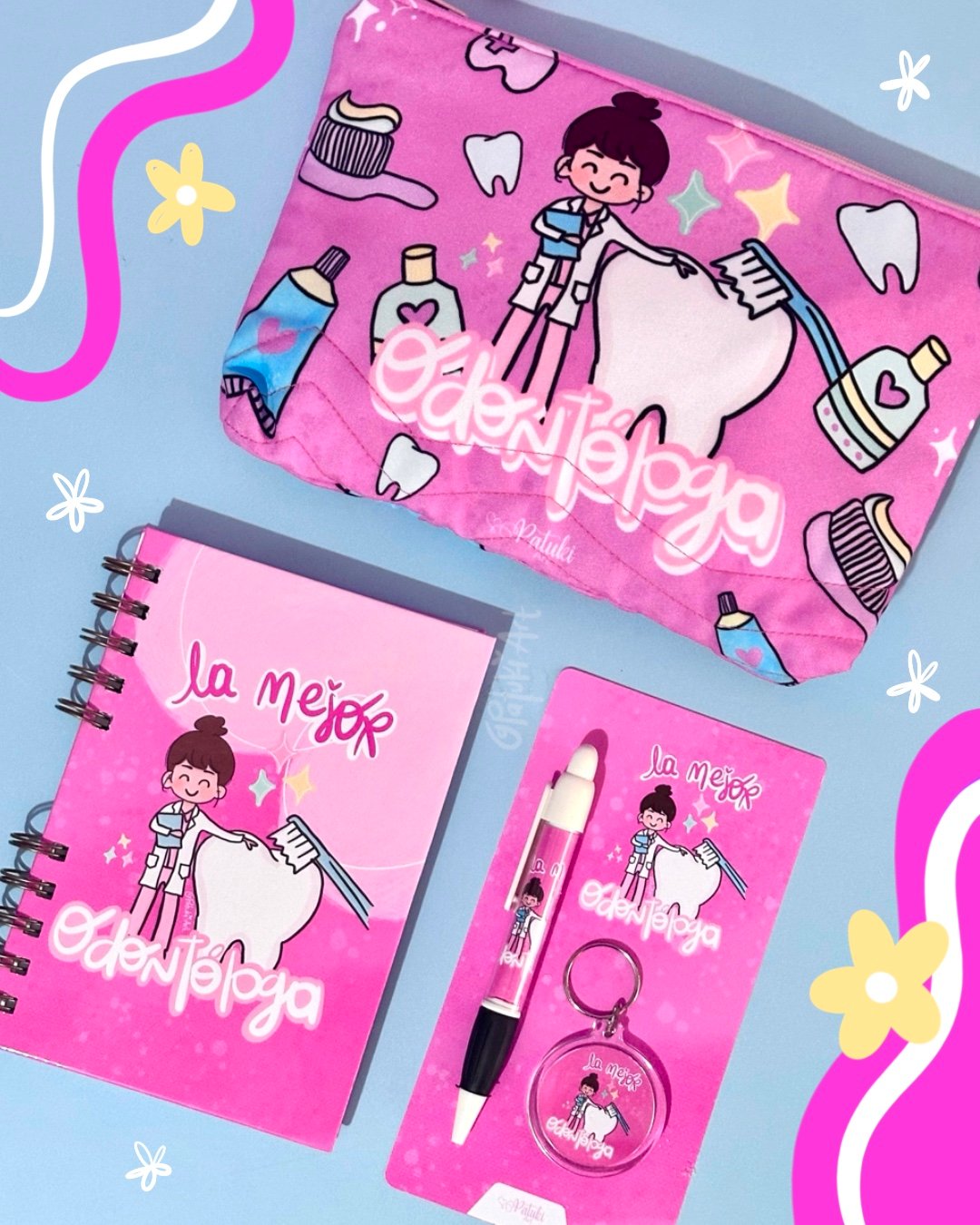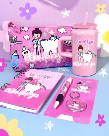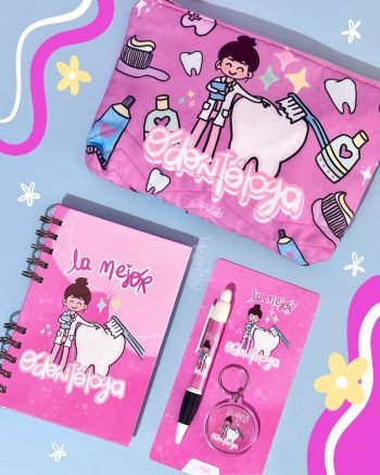 Kit completo para tu Odontóloga favorita, incluye: Termo metálico, organizador en lino flex, libreta de apuntes y kit de llavero con lapicero.