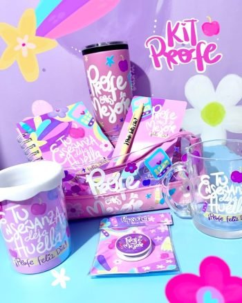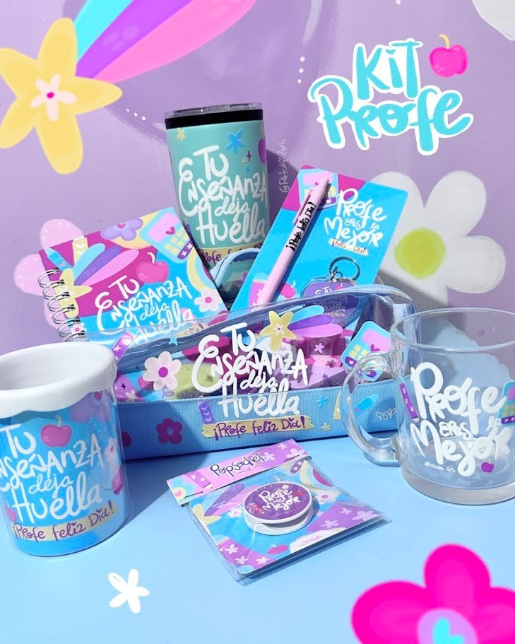 Kit Profe con cartuchera, termo en acero, popsochet, mug de vidrio, portalapiceros, kit llavero + lapicero y libreta pequeña. No personalizable..