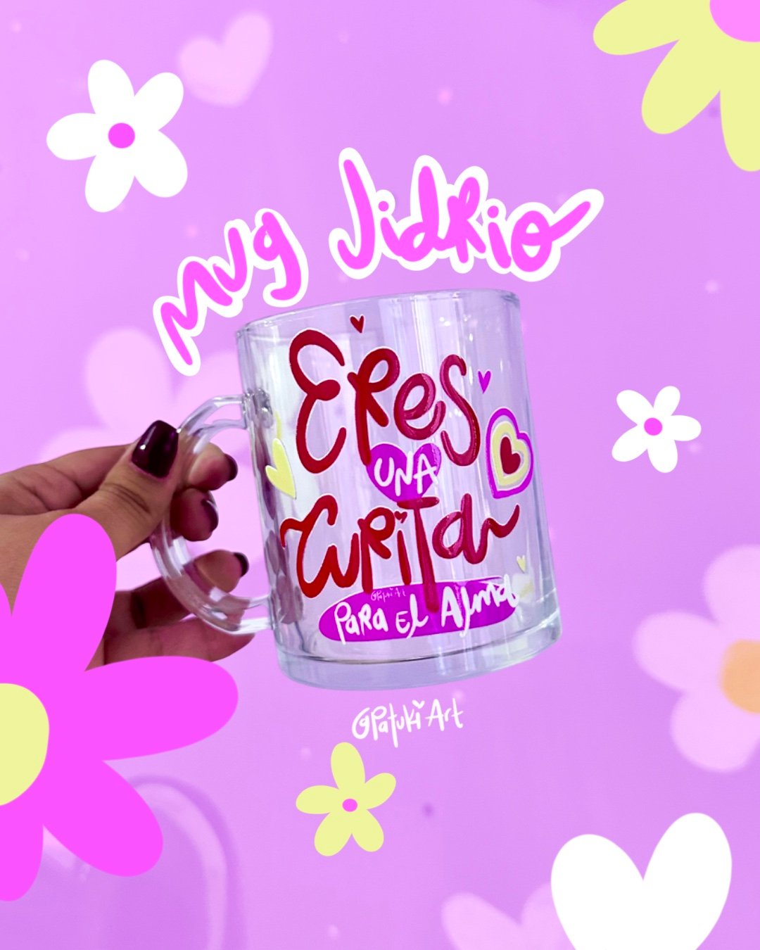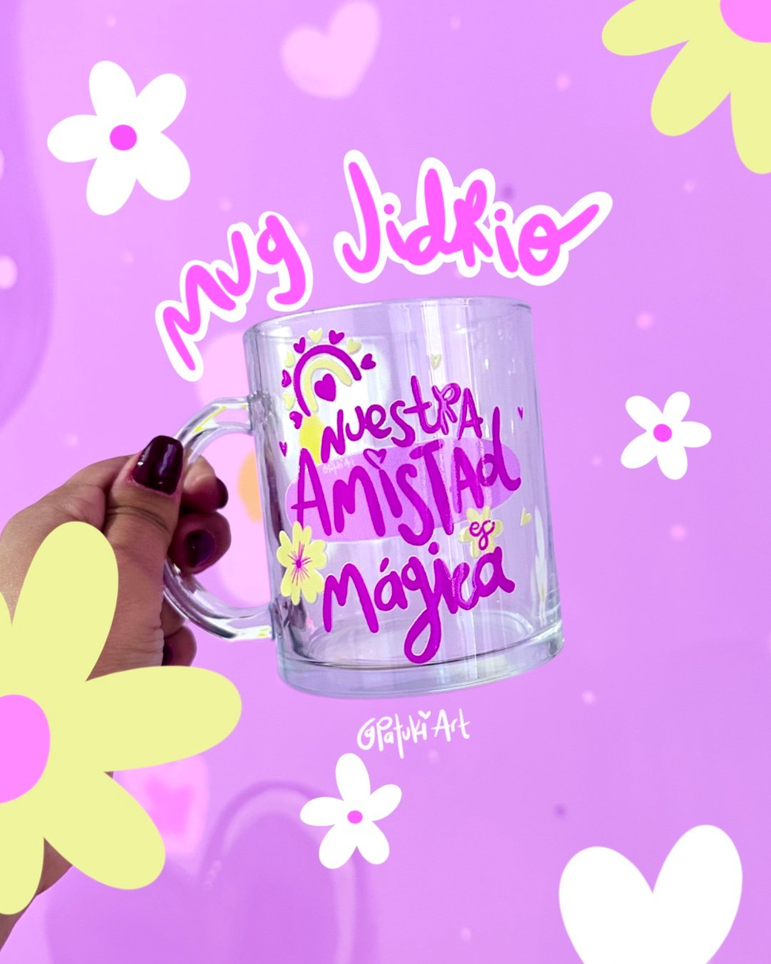 Mug en vidrio transparente con frase de amor y amistad.