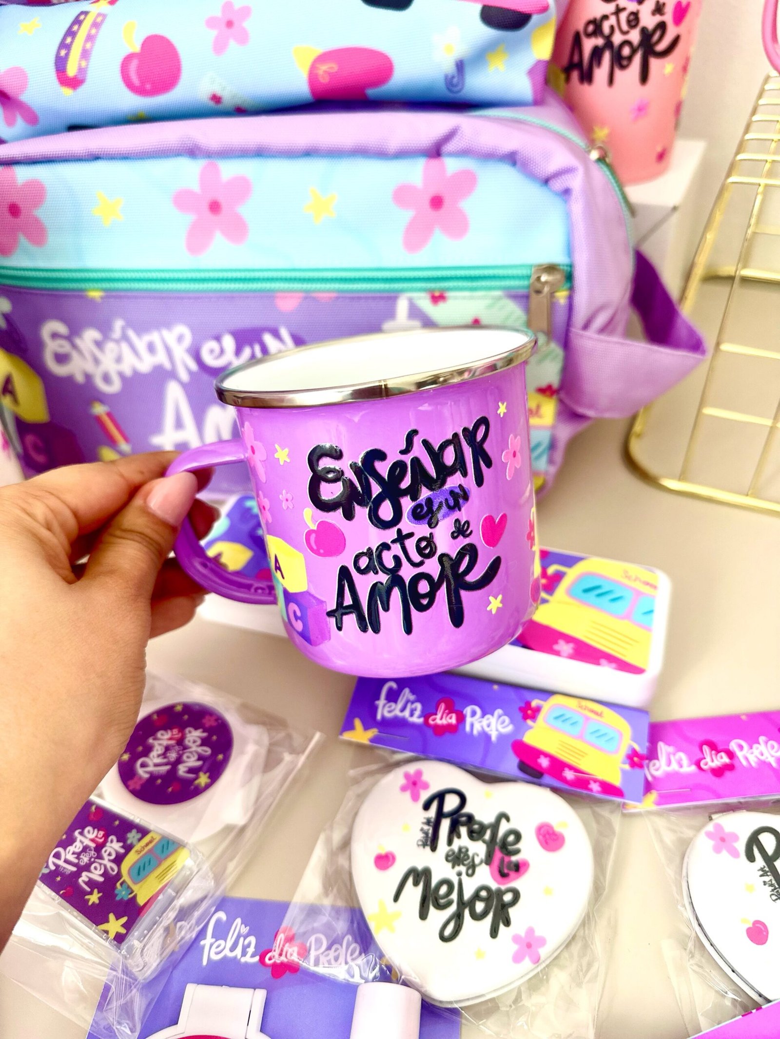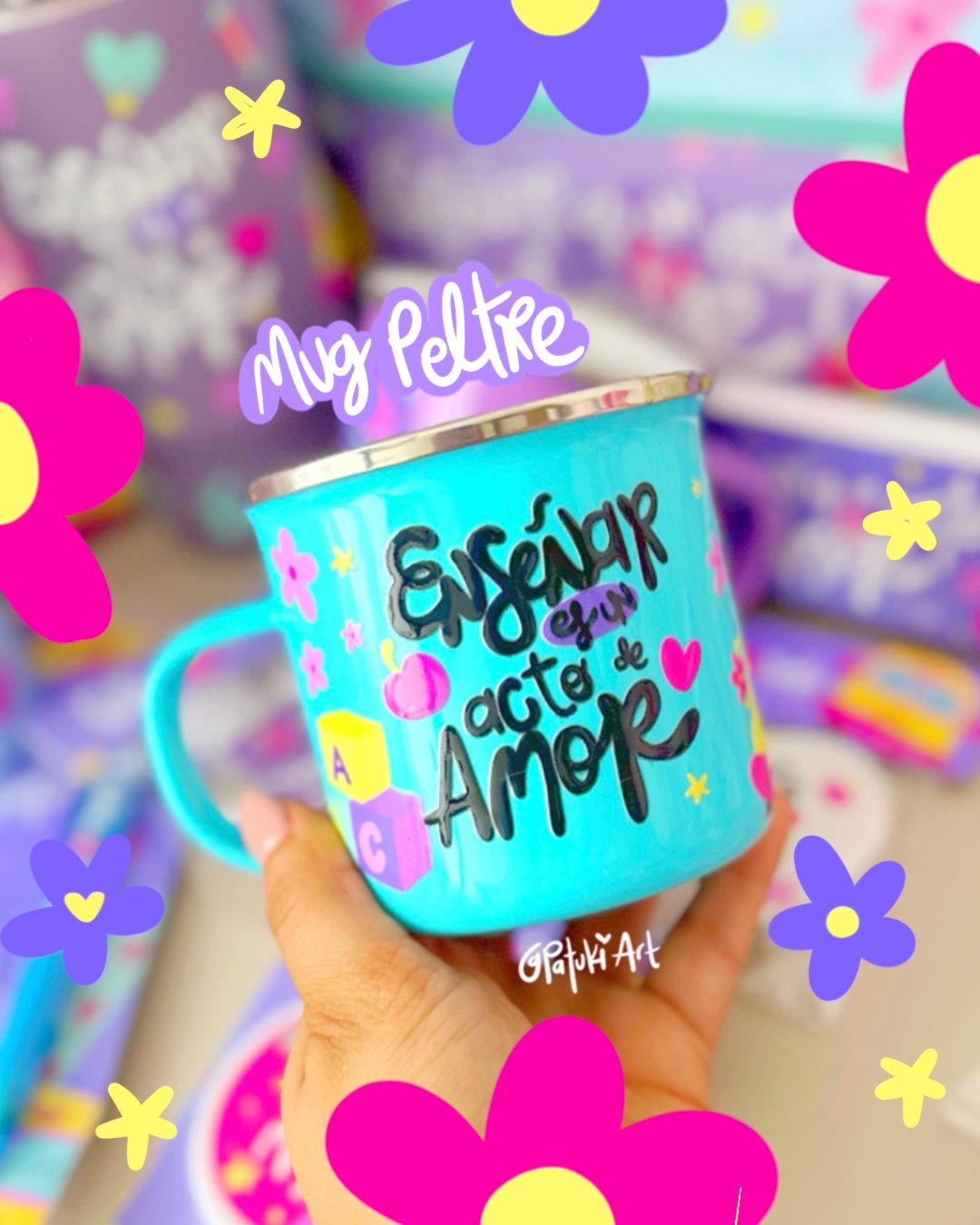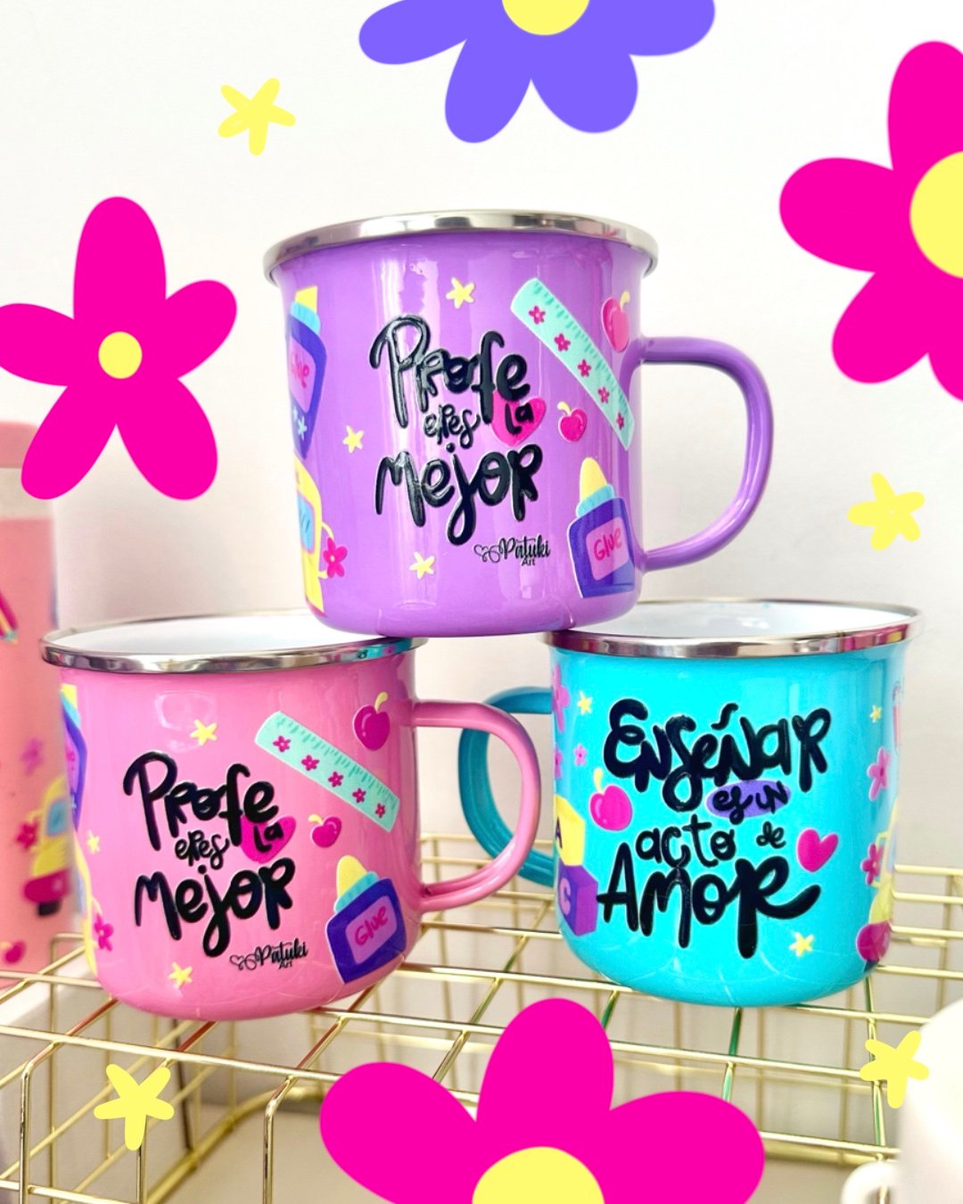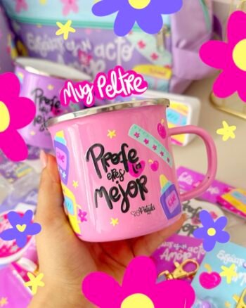 Mug peltre profe; Rosado, morado o azul. Elige el que más te guste.